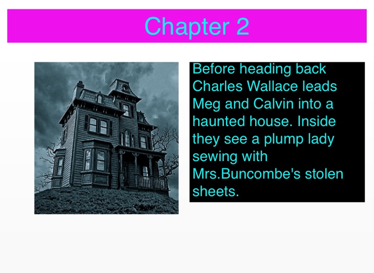 Before heading back Charles Wallace leads Meg and Calvin into a haunted house. Inside they see a plump lady sewing with Mrs.Buncombe's stolen sheets.