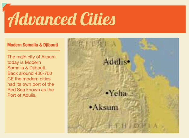 The main city of Aksum today is Modern Somalia & Djibouti. Back around 400-700 CE the modern cities had its own port of the Red Sea known as the Port of Adulis.