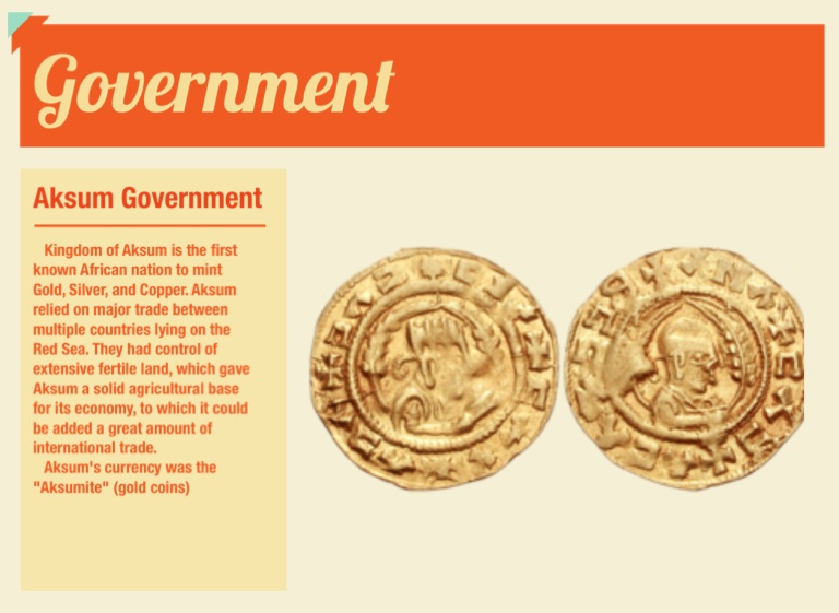 Kingdom of Aksum is the first known African nation to mint Gold, Silver, and Copper. Aksum relied on major trade between multiple countries lying on the Red Sea. They had control of extensive fertile land, which gave Aksum a solid agricultural base for its economy, to which it could be added a great amount of international trade.