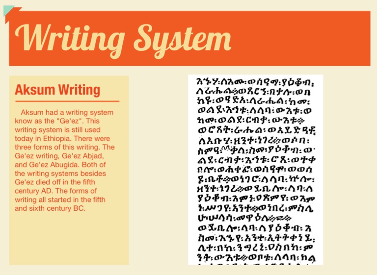 Aksum had a writing system know as the "Ge'ez". This writing system is still used today in Ethiopia. There were three forms of this writing. The Ge'ez writing, Ge'ez Abjad, and Ge'ez Abugida. Both of the writing systems besides Ge'ez died off in the fifth century AD. The forms of writing all started in the fifth and sixth century BC.