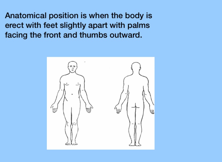 Anatomical position is when the body is erect with feet slightly apart with palms facing the front and thumbs outward.