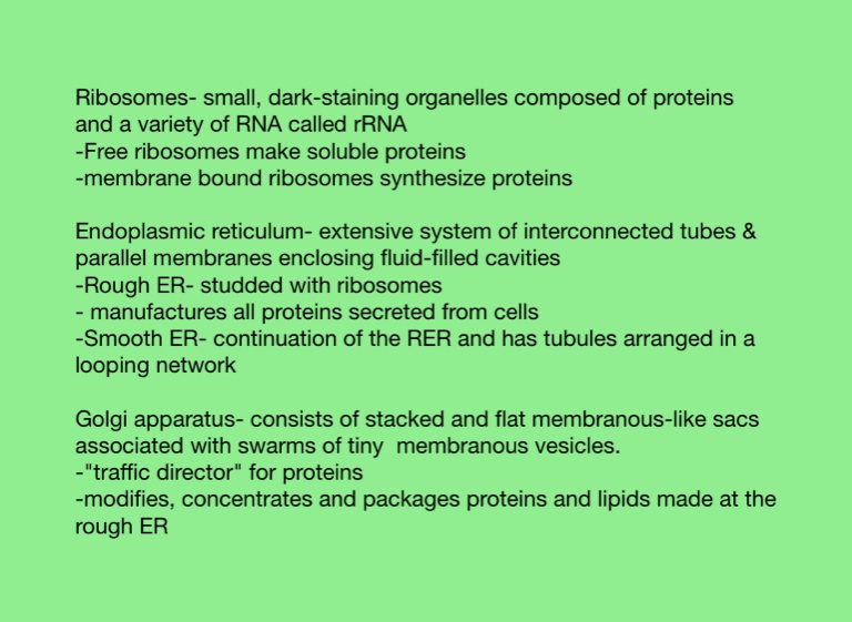 Ribosomes- small, dark-staining organelles composed of proteins and a variety of RNA called rRNA
