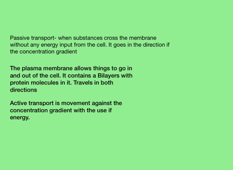 Passive transport- when substances cross the membrane without any energy input from the cell. It goes in the direction if the concentration gradient