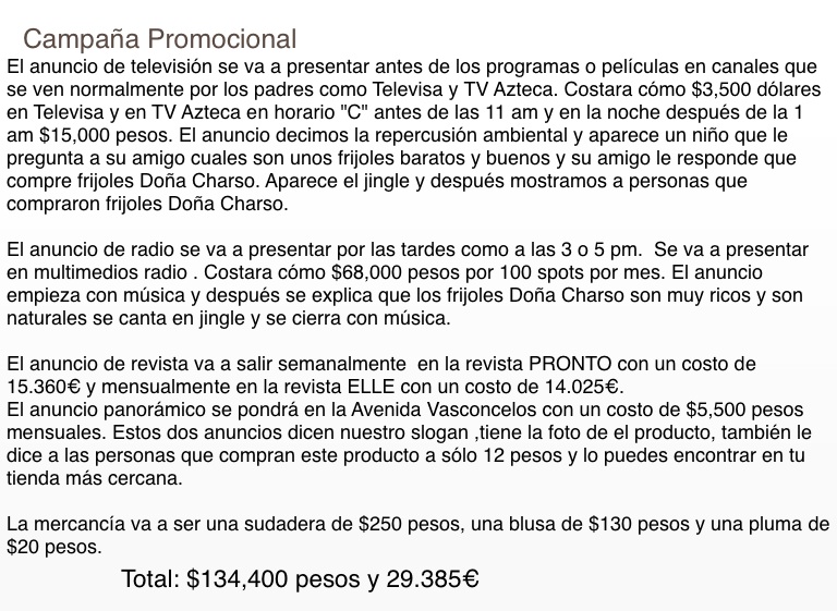 El anuncio de televisión se va a presentar antes de los programas o películas en canales que se ven normalmente por los padres como Televisa y TV Azteca. Costara cómo $3,500 dólares en Televisa y en TV Azteca en horario "C" antes de las 11 am y en la noche después de la 1 am $15,000 pesos. El anuncio decimos la repercusión ambiental y aparece un niño que le pregunta a su amigo cuales son unos frijoles baratos y buenos y su amigo le responde que compre frijoles Doña Charso. Aparece el jingle y después mostramos a personas que compraron frijoles Doña Charso.