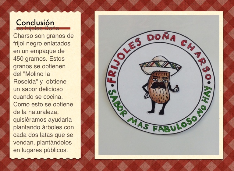 Los frijoles Doña Charso son granos de frijol negro enlatados en un empaque de 450 gramos. Estos granos se obtienen del "Molino la Roselda" y obtiene un sabor delicioso cuando se cocina. Como esto se obtiene de la naturaleza, quisiéramos ayudarla plantando árboles con cada dos latas que se vendan, plantándolos en lugares públicos.