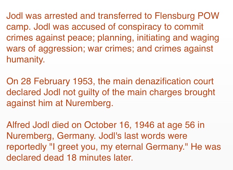 Jodl was arrested and transferred to Flensburg POW camp. Jodl was accused of conspiracy to commit crimes against peace; planning, initiating and waging wars of aggression; war crimes; and crimes against humanity.