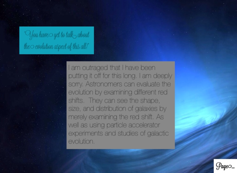 I am outraged that I have been putting it off for this long. I am deeply sorry. Astronomers can evaluate the evolution by examining different red shifts. They can see the shape, size, and distribution of galaxies by merely examining the red shift. As well as using particle accelerator experiments and studies of galactic evolution.