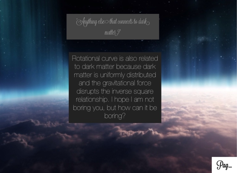 Rotational curve is also related to dark matter because dark matter is uniformly distributed and the gravitational force disrupts the inverse square relationship. I hope I am not boring you, but how can it be boring?