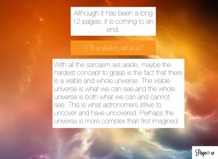 With all the sarcasm set aside, maybe the hardest concept to grasp is the fact that there is a visible and whole universe. The visible universe is what we can see,and the whole universe is both what we can and cannot see. This is what astronomers strive to uncover and have uncovered. Perhaps the universe is more complex than first imagined.