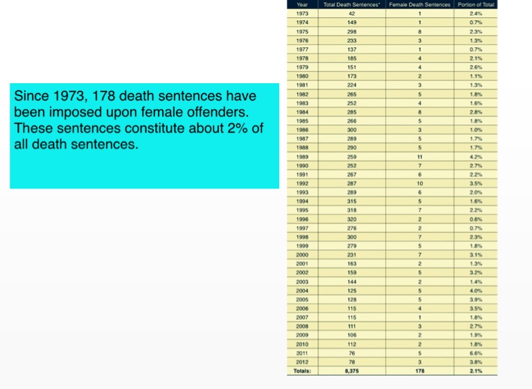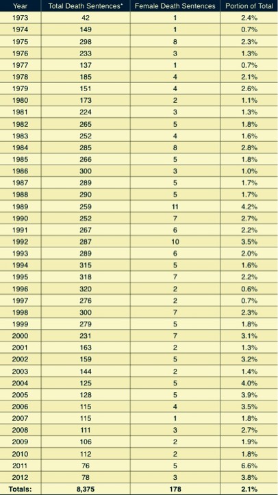 Since 1973, 178 death sentences have been imposed upon female offenders. These sentences constitute about 2% of all death sentences.