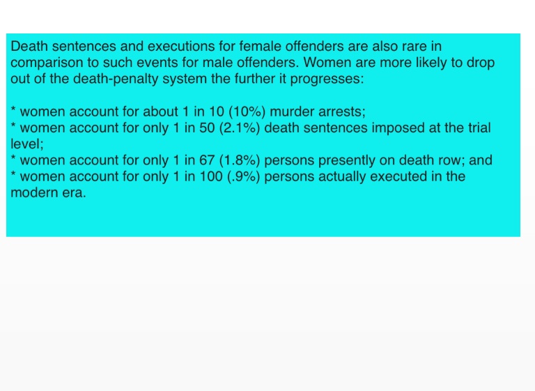 Death sentences and executions for female offenders are also rare in comparison to such events for male offenders. Women are more likely to drop out of the death-penalty system the further it progresses: