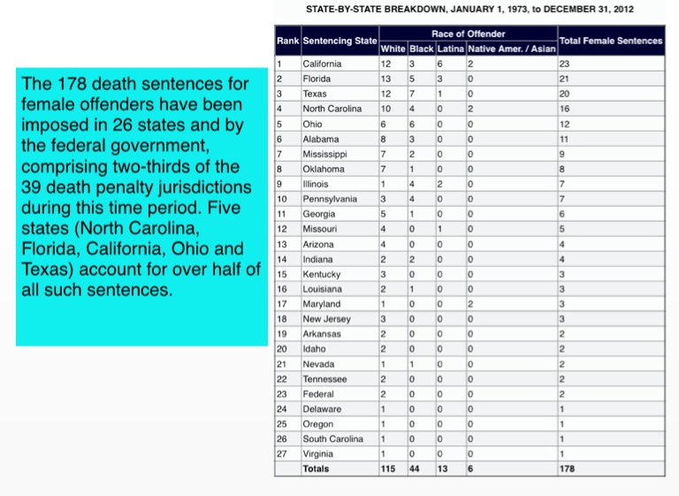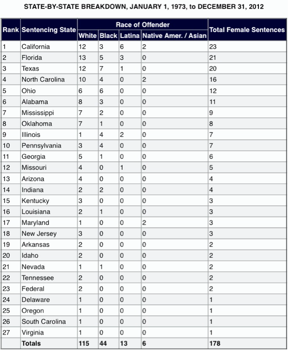 The 178 death sentences for female offenders have been imposed in 26 states and by the federal government, comprising two-thirds of the 39 death penalty jurisdictions during this time period. Five states (North Carolina, Florida, California, Ohio and Texas) account for over half of all such sentences.