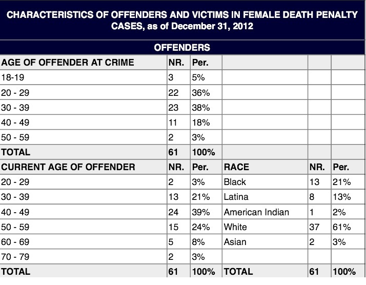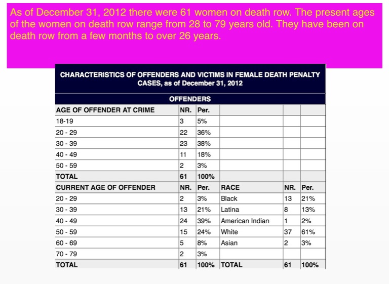 As of December 31, 2012 there were 61 women on death row. The present ages of the women on death row range from 28 to 79 years old. They have been on death row from a few months to over 26 years.