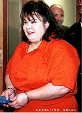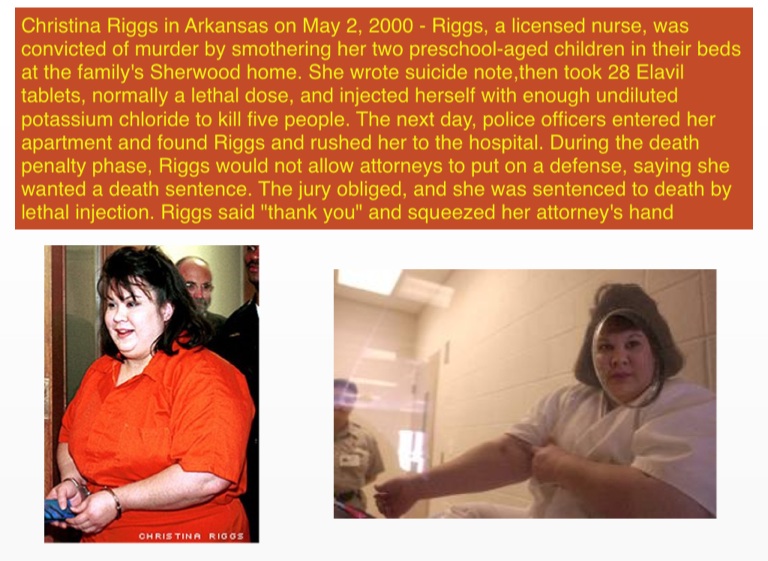 Christina Riggs in Arkansas on May 2, 2000 - Riggs, a licensed nurse, was convicted of murder by smothering her two preschool-aged children in their beds at the family's Sherwood home. She wrote suicide note,then took 28 Elavil tablets, normally a lethal dose, and injected herself with enough undiluted potassium chloride to kill five people. The next day, police officers entered her apartment and found Riggs and rushed her to the hospital. During the death penalty phase, Riggs would not allow attorneys to put on a defense, saying she wanted a death sentence. The jury obliged, and she was sentenced to death by lethal injection. Riggs said "thank you" and squeezed her attorney's hand