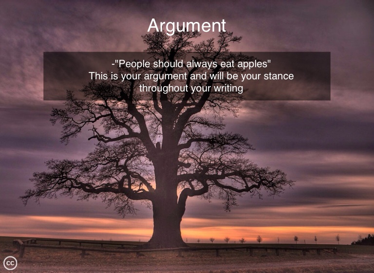 -"People should always eat apples" This is your argument and will be your stance throughout your writing