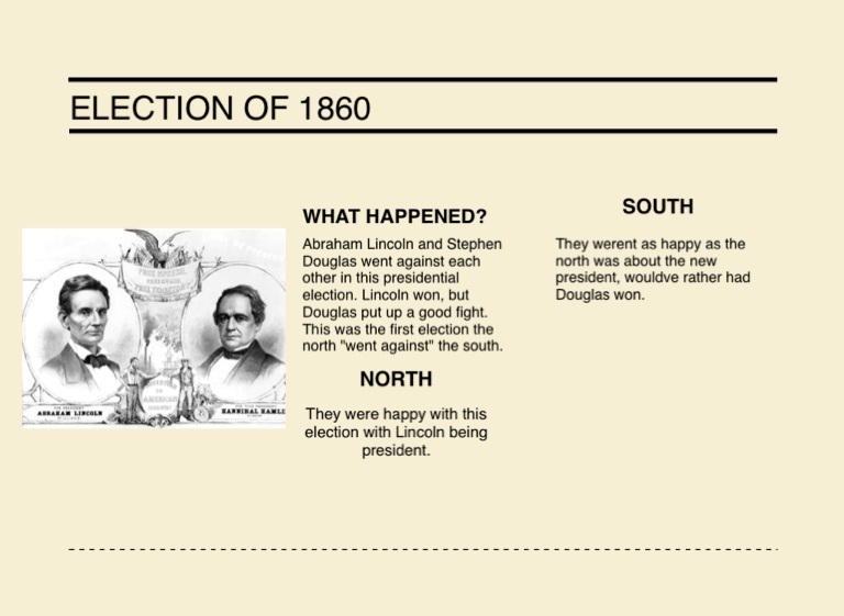Abraham Lincoln and Stephen Douglas went against each other in this presidential election. Lincoln won, but Douglas put up a good fight. This was the first election the north "went against" the south.