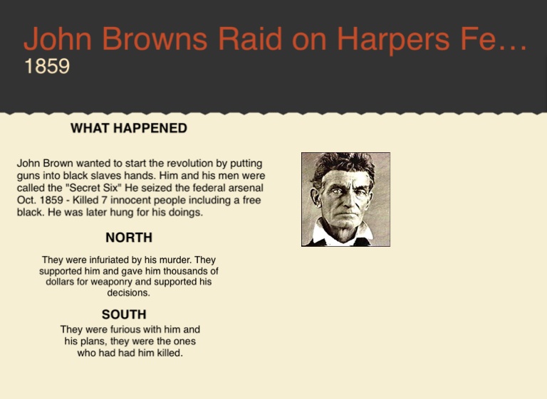 John Brown wanted to start the revolution by putting guns into black slaves hands. Him and his men were called the "Secret Six" He seized the federal arsenal Oct. 1859 - Killed 7 innocent people including a free black. He was later hung for his doings.