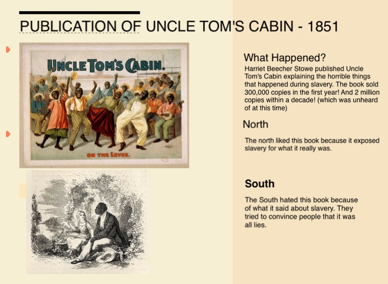 Harriet Beecher Stowe published Uncle Tom's Cabin explaining the horrible things that happened during slavery. The book sold 300,000 copies in the first year! And 2 million copies within a decade! (which was unheard of at this time)