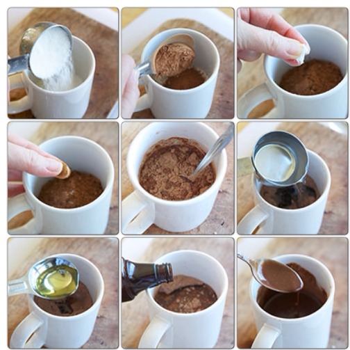 -Place flour, sugar, cocoa, salt, and cinnamon in a microwave safe ceramic mug.