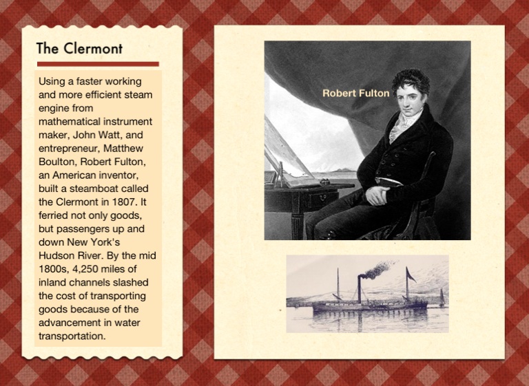 Using a faster working and more efficient steam engine from mathematical instrument maker, John Watt, and entrepreneur, Matthew Boulton, Robert Fulton, an American inventor, built a steamboat called the Clermont in 1807. It ferried not only goods, but passengers up and down New York's Hudson River. By the mid 1800s, 4,250 miles of inland channels slashed the cost of transporting goods because of the advancement in water transportation.