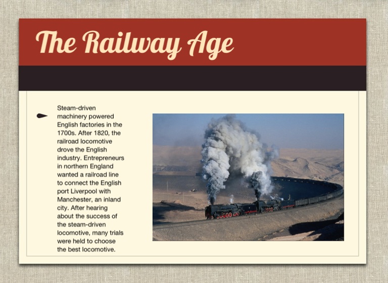 Steam-driven machinery powered English factories in the 1700s. After 1820, the railroad locomotive drove the English industry. Entrepreneurs in northern England wanted a railroad line to connect the English port Liverpool with Manchester, an inland city. After hearing about the success of the steam-driven locomotive, many trials were held to choose the best locomotive.