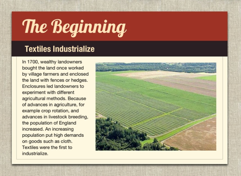 In 1700, wealthy landowners bought the land once worked by village farmers and enclosed the land with fences or hedges. Enclosures led landowners to experiment with different agricultural methods. Because of advances in agriculture, for example crop rotation, and advances in livestock breeding, the population of England increased. An increasing population put high demands on goods such as cloth. Textiles were the first to industrialize.