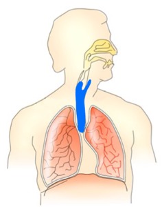 The trachea, or the wind pipe, emerges from below the larynx and goes down below through the neck.