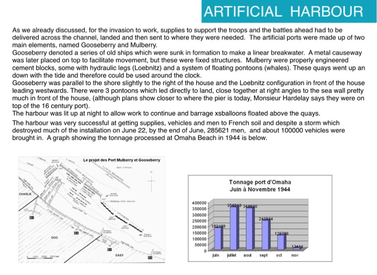 The harbour was very successful at getting supplies, vehicles and men to French soil and despite a storm which destroyed much of the installation on June 22, by the end of June, 285621 men, and about 100000 vehicles were brought in. A graph showing the tonnage processed at Omaha Beach in 1944 is below.