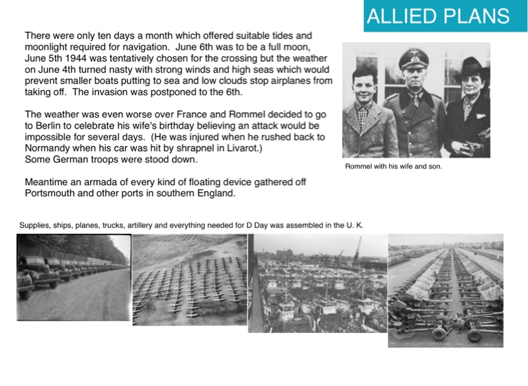The weather was even worse over France and Rommel decided to go to Berlin to celebrate his wife's birthday believing an attack would be impossible for several days. (He was injured when he rushed back to Normandy when his car was hit by shrapnel in Livarot.)