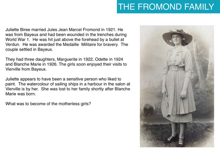 Juliette Biree married Jules Jean Marcel Fromond in 1921. He was from Bayeux and had been wounded in the trenches during World War 1. He was hit just above the forehead by a bullet at Verdun. He was awarded the Medaille Militaire for bravery. The couple settled in Bayeux.