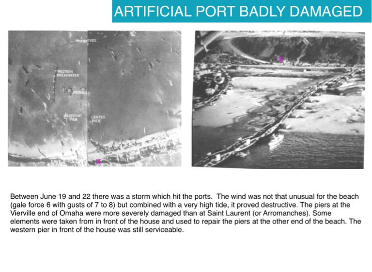 Between June 19 and 22 there was a storm which hit the ports. The wind was not that unusual for the beach (gale force 6 with gusts of 7 to 8) but combined with a very high tide, it proved destructive. The piers at the Vierville end of Omaha were more severely damaged than at Saint Laurent (or Arromanches). Some elements were taken from in front of the house and used to repair the piers at the other end of the beach. The western pier in front of the house was still serviceable.