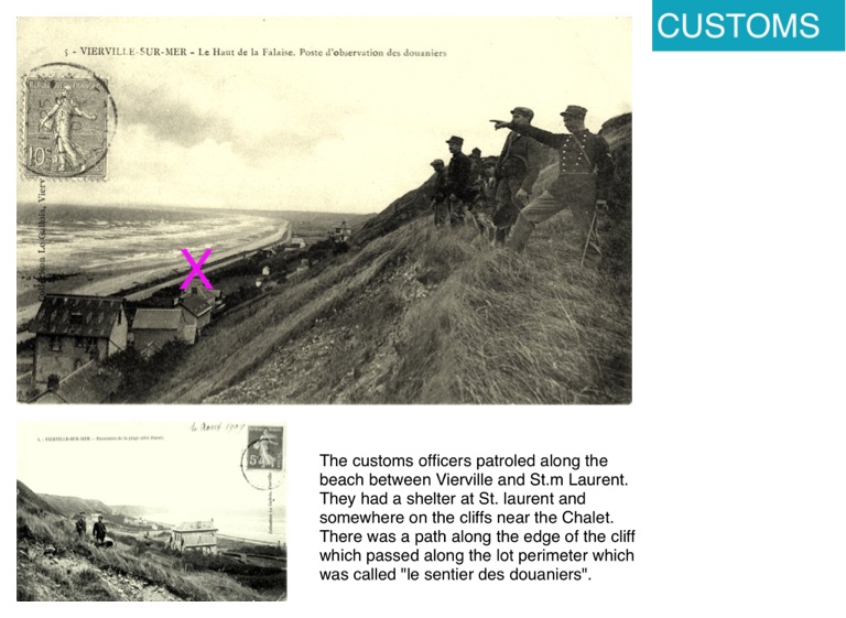 The customs officers patroled along the beach between Vierville and St.m Laurent. They had a shelter at St. laurent and somewhere on the cliffs near the Chalet. There was a path along the edge of the cliff which passed along the lot perimeter which was called "le sentier des douaniers".