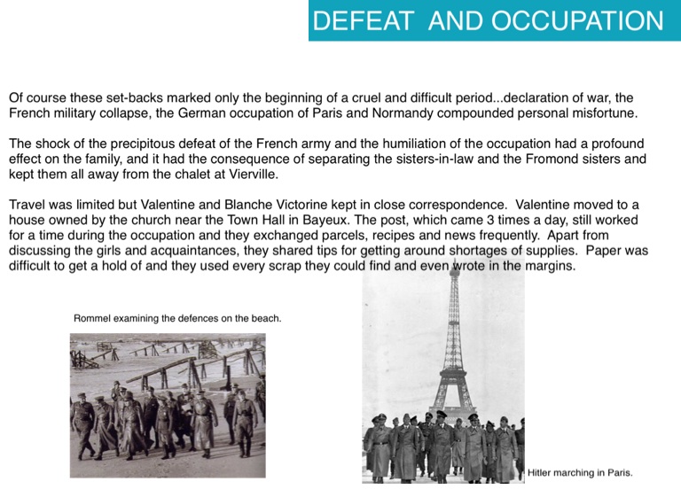 The shock of the precipitous defeat of the French army and the humiliation of the occupation had a profound effect on the family, and it had the consequence of separating the sisters-in-law and the Fromond sisters and kept them all away from the chalet at Vierville.