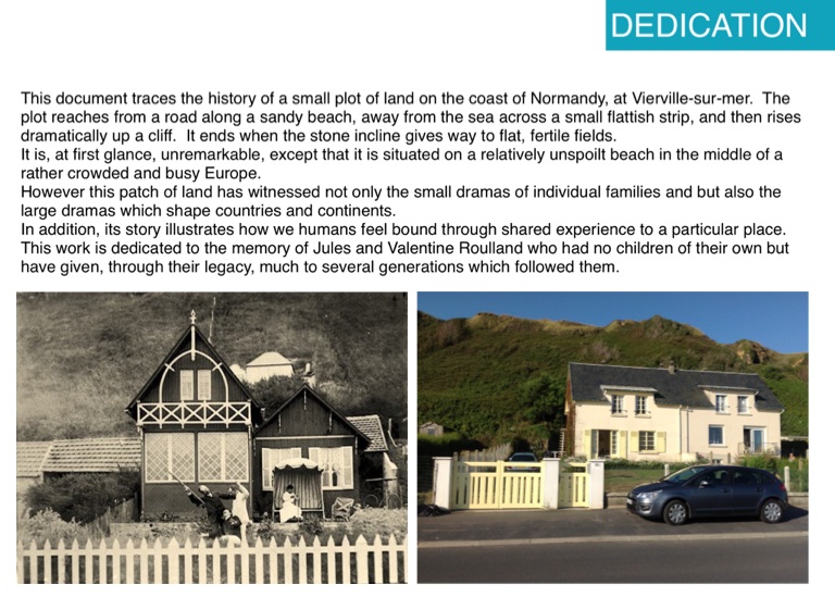 This document traces the history of a small plot of land on the coast of Normandy, at Vierville-sur-mer. The plot reaches from a road along a sandy beach, away from the sea across a small flattish strip, and then rises dramatically up a cliff. It ends when the stone incline gives way to flat, fertile fields.