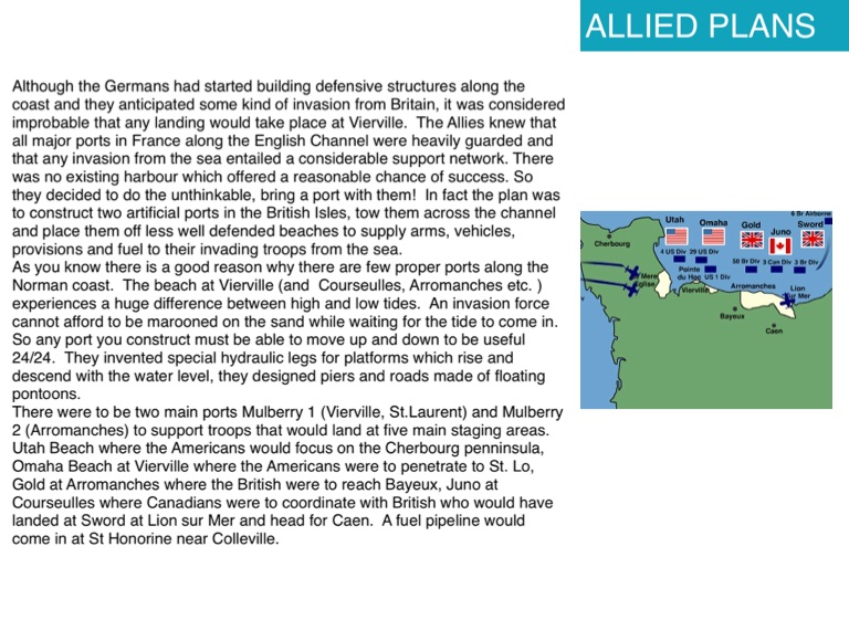 There were to be two main ports Mulberry 1 (Vierville, St.Laurent) and Mulberry 2 (Arromanches) to support troops that would land at five main staging areas. Utah Beach where the Americans would focus on the Cherbourg penninsula, Omaha Beach at Vierville where the Americans were to penetrate to St. Lo, Gold at Arromanches where the British were to reach Bayeux, Juno at Courseulles where Canadians were to coordinate with British who would have landed at Sword at Lion sur Mer and head for Caen. A fuel pipeline would come in at St Honorine near Colleville.