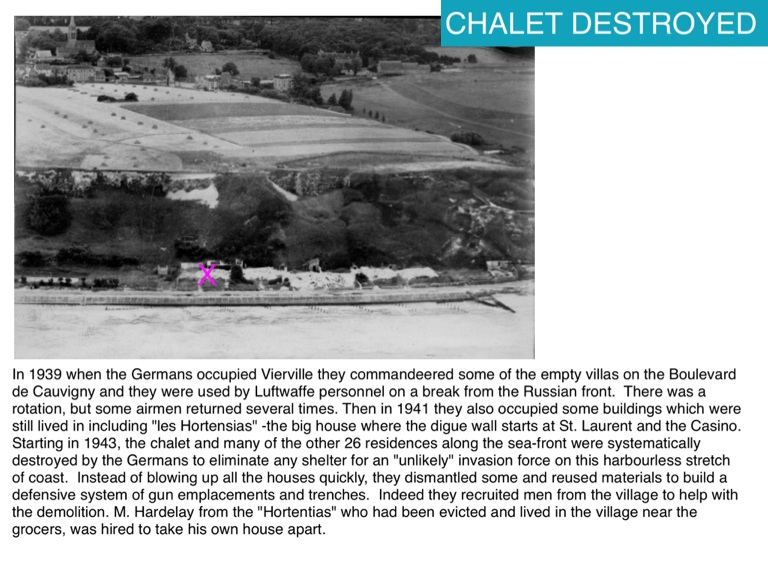 Starting in 1943, the chalet and many of the other 26 residences along the sea-front were systematically destroyed by the Germans to eliminate any shelter for an "unlikely" invasion force on this harbourless stretch of coast. Instead of blowing up all the houses quickly, they dismantled some and reused materials to build a defensive system of gun emplacements and trenches. Indeed they recruited men from the village to help with the demolition. M. Hardelay from the "Hortentias" who had been evicted and lived in the village near the grocers, was hired to take his own house apart.