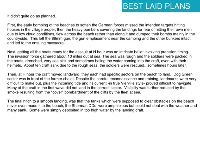 First, the early bombing of the beaches to soften the German forces missed the intended targets hitting houses in the village proper, then the heavy bombers covering the landings for fear of hitting their own men due to low cloud conditions, flew across the beach rather than along it and dumped their bombs mainly in the countryside. This left the 88mm gun, the gun emplacement near the camping and the other bunkers intact and led to the ensuing massacre.