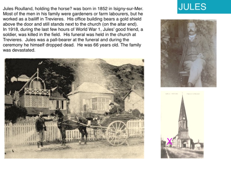 In 1918, during the last few hours of World War 1, Jules' good friend, a soldier, was killed in the field. His funeral was held in the church at Trevieres. Jules was a pall-bearer at the funeral and during the ceremony he himself dropped dead. He was 66 years old. The family was devastated.