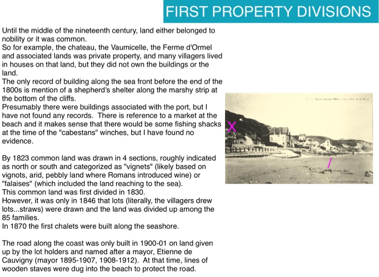 By 1823 common land was drawn in 4 sections, roughly indicated as north or south and categorized as "vignets" (likely based on vignots, arid, pebbly land where Romans introduced wine) or "falaises" (which included the land reaching to the sea).