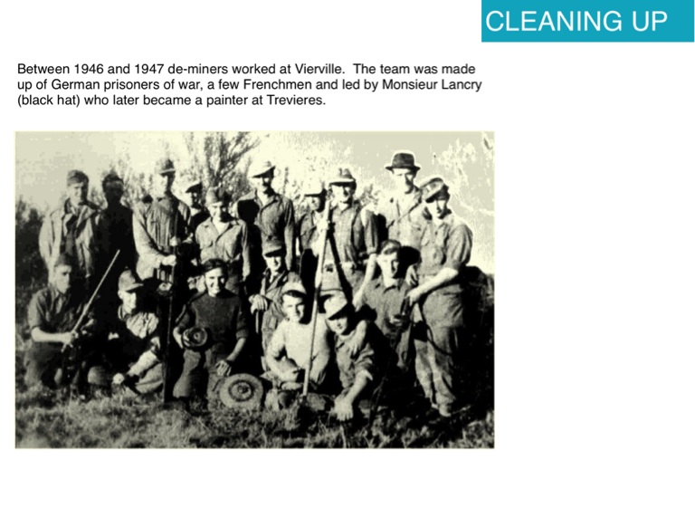 Between 1946 and 1947 de-miners worked at Vierville. The team was made up of German prisoners of war, a few Frenchmen and led by Monsieur Lancry (black hat) who later became a painter at Trevieres.