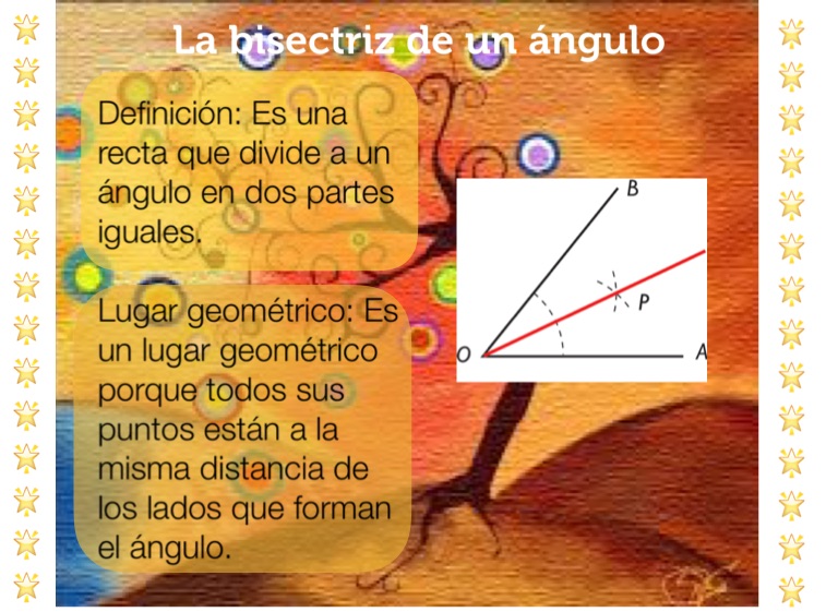 Lugar geomΓ©trico: Es un lugar geomΓ©trico porque todos sus puntos estΓ‘n a la misma distancia de los lados que forman el Γ‘ngulo.
