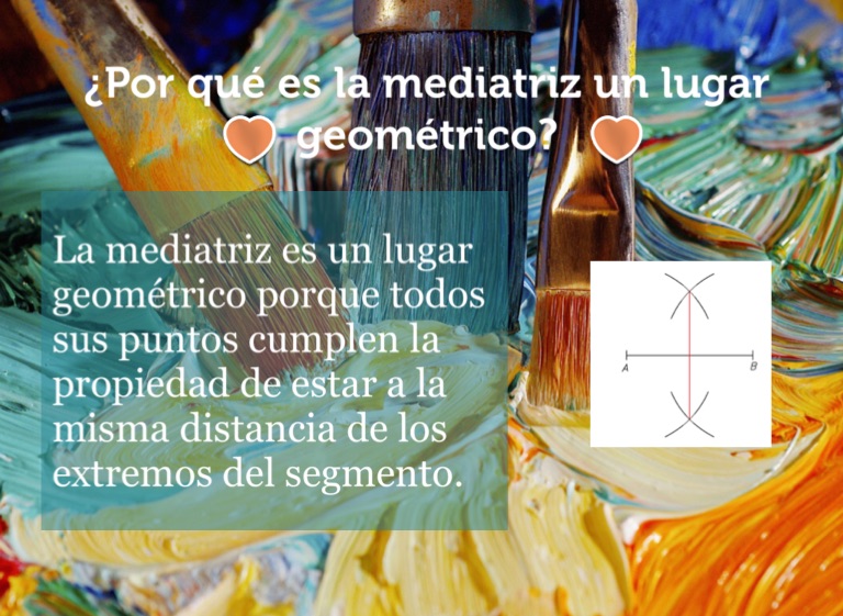 La mediatriz es un lugar geométrico porque todos sus puntos cumplen la propiedad de estar a la misma distancia de los extremos del segmento.