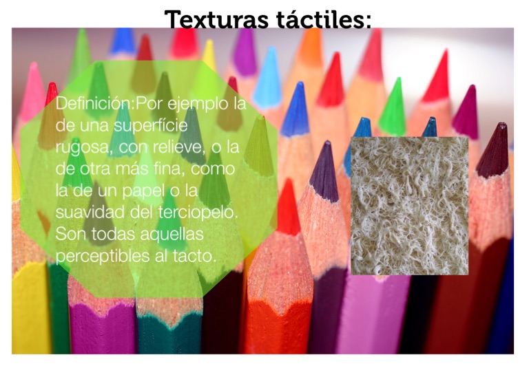 Definición:Por ejemplo la de una superfÃcie rugosa, con relieve, o la de otra más fina, como la de un papel o la suavidad del terciopelo. Son todas aquellas perceptibles al tacto.