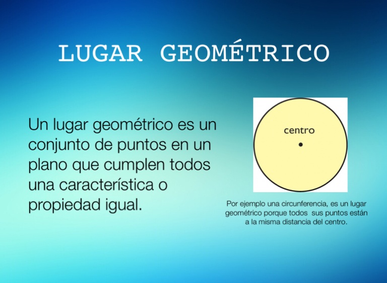 Un lugar geométrico es un conjunto de puntos en un plano que cumplen todos una caracterÃstica o propiedad igual.