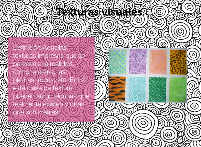 DefiniciΓ³n:Aquellas texturas impresas que se parecen a la realidad, como la arena, las piedras, rocas, etc. Entre esta clase de textura pueden surgir algunas que realmente existen y otras que son irreales.