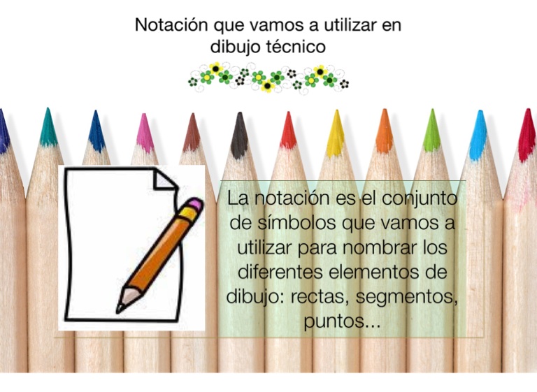 La notación es el conjunto de sÃmbolos que vamos a utilizar para nombrar los diferentes elementos de dibujo: rectas, segmentos, puntos...