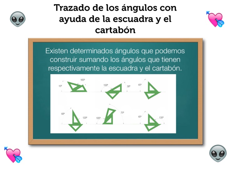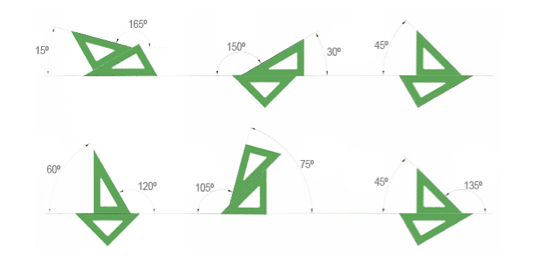 Existen determinados ángulos que podemos construir sumando los ángulos que tienen respectivamente la escuadra y el cartabón.