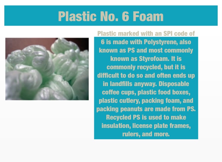Plastic marked with an SPI code of 6 is made with Polystyrene, also known as PS and most commonly known as Styrofoam. It is commonly recycled, but it is difficult to do so and often ends up in landfills anyway. Disposable coffee cups, plastic food boxes, plastic cutlery, packing foam, and packing peanuts are made from PS. Recycled PS is used to make insulation, license plate frames, rulers, and more.