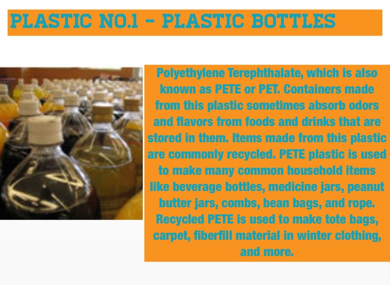 Polyethylene Terephthalate, which is also known as PETE or PET. Containers made from this plastic sometimes absorb odors and flavors from foods and drinks that are stored in them. Items made from this plastic are commonly recycled. PETE plastic is used to make many common household items like beverage bottles, medicine jars, peanut butter jars, combs, bean bags, and rope. Recycled PETE is used to make tote bags, carpet, fiberfill material in winter clothing, and more.