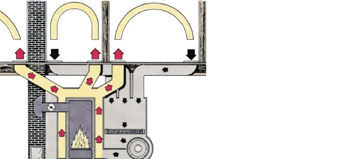 As you can see in the picture above the air is heated up by the furnace and it radiates upward into the vents and the cold air flows into the other vent and the process repeats itself.